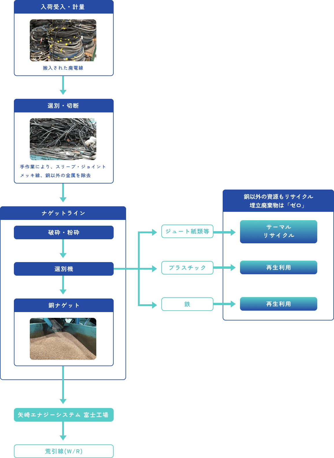 受入→計量→ 選別・切断→破砕→粉砕→風力・比重・磁力選別 等の各工程を通じて① 銅ナゲット ② 廃プラスチック